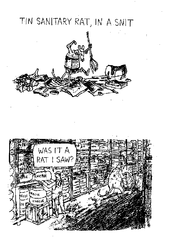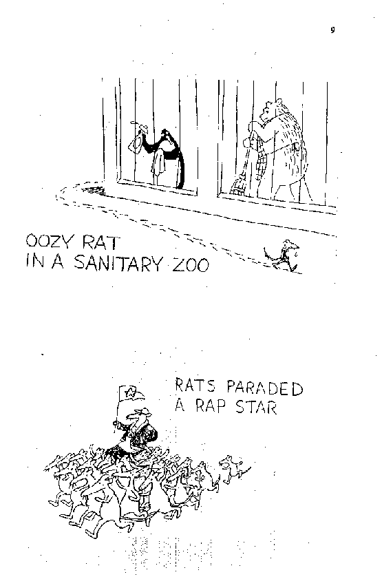 .That night at the book party, by the time Dr. Awkward related to me the details of the group of secret palindromists known as The Five A's, or R@STAR, I was already on the other side of the Blackout. Staring into my nth glass of wine, I noticed its surface has developed a strange glint. I saw my own hugely magnified image staring back at me, but it was a genie, not me, that spoke: "Drink this, this is my blood, which will be shed for you." Beyond Blackout, there is Communion. Here you eat His body and drink His blood. By the end of the book party, my rancid breath of limburger and wine kept all but the good Doctor away from communion with me. A drunk and drooling cheesemonger, I had finally become the upright Rabid Rodent of my destiny and had frightened away all the human chatterers. At last, the book party's man of honor spoke to me alone.